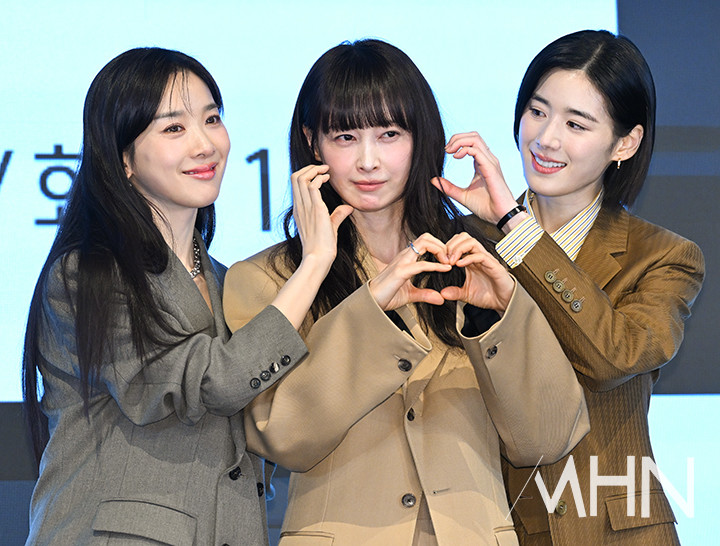 (MHN 이현지 기자) 배우 이청아, 이나영, 정은채가 26일 오후 서울 구로구 더세인트에서 진행된 ENA 월화드라마 '아너 : 그녀들의 법정' 제작발표회에 참석해 포토타임을 갖고 있다.
