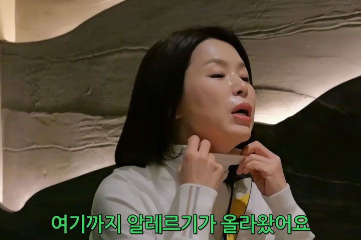 목티를 내려 보인 김지선은 "알레르기가 여기까지 올라왔다. 오늘은 많이 좋아진 상태"라고 설명했다. 이어 "예뻐지려고 시술을 했는데 너무 과했는지 알레르기가 올라왔다"고 부작용을 토로했다.