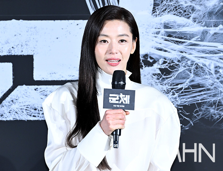 (MHN 이현지 기자) 배우 전지현이 6일 오전 서울 용산구 CGV 용산아이파크몰점에서 진행된 '군체' 제작보고회에 참석하고 있다.